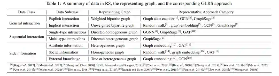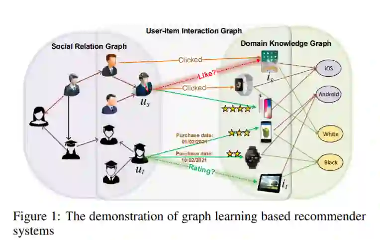 图学习具有学习复杂关系的能力。作为最具发展前景的机器学习技术之一,GL在获取嵌入在不同类型图中的知识方面显示出了巨大的潜力。具体来说,许多GL技术,如随机游走和图神经网络,已经被开发出来学习特定类型的关系由图建模,并被证明是相当有效的[Wu et al., 2021]。因此,使用GL来建模RS中的各种关系是一个自然和令人信服的选择。
