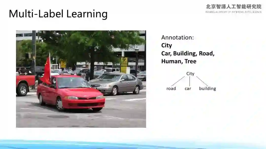 除此之外,还有 Multi-Label Learning。以下图为例,对于其中这张图像我们会有一个标注,这张标注可能是关于城市的,可能是汽车、楼房,也可能是道路、人、树。这些标签之间彼此关联(如下图右侧关系树所示),一张图像会用不同的标签,而我们则应充分利用这些标签之间的关系,从而使我们的预测结果更为准确——这就是“多标签学习”。
