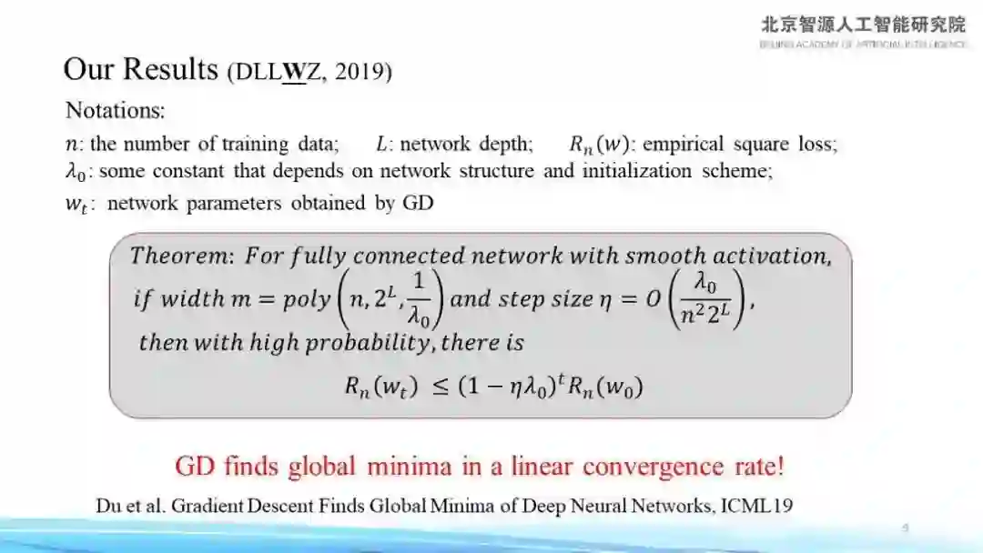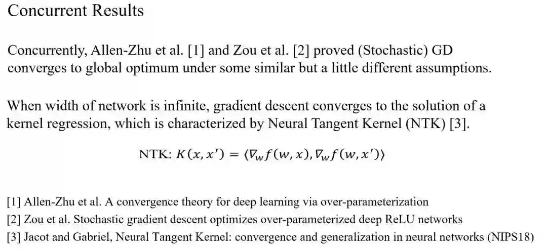 总而言之,一是网络足够宽,二是用高斯随机初始化,在这两个假设条件下只要从随机初始化点出发,用一阶梯度下降的方法就可以在非常快的迭代步数之内找到全局最优点。这个结论能够使我们理解实验中观测到的很多现象,其中我们关注的核心就是为什么能找到全局最优点——深度神经网络充分宽以后,就相当于一个非常特殊的过参数化(Over-Parameterization)模型,利用到了神经网络的一些特殊性质,和过去的模型有很大差异。