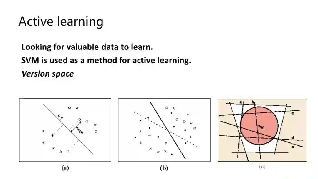 如上图所示,毫无疑问在整个图像中再给更多左下角和右上角的样本其实意义不大,都能猜到那个地方不是×就是⚪,而且信息很充足。其实最容易出错的地方是在分界线附近,这个方法告诉我们,如果要标样本,在分界线附近的那些地方是最有价值的,只消标少量样本就可以达到很高的学习准确率。该办法经证明可以迅速缩小解空间,继而很快集中到所要的那个解,且在解空间上每标一个样本,就相当于对整个解空间做划分。Active learning 实际上与学习范式有关,其与学习模型和学习方法相结合,是减少标注样本的一个高效方法。