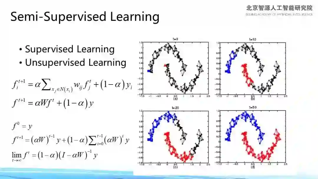 运用这个方法时会有这样的情况:构造一个目标函数,并通过不断迭代的方法给出一个解,最后这个解会收敛,收敛结果是上图中的最底下一行。这是我们团队早期在 2009 年左右的一项工作,借此我们了解到半监督学习一定会收敛,同时还分析了它和已有的流形学习之间存在的关系。
