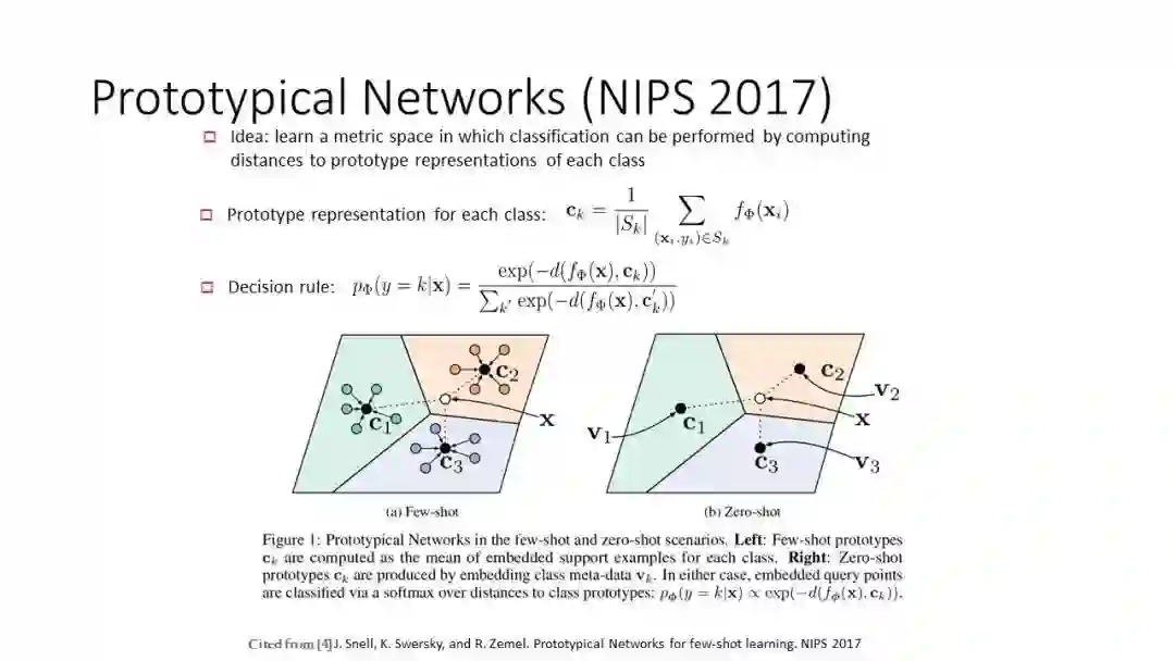 Prototypicalnets 的主要思路是为每一类生成一个原型表征,这个表征可以通过对该类仅有的几个样本的 embedding 进行平均而得到,如果每一类只有一个训练样本,那该仅有的单样本的 embedding 自然就是该类的原型表征。