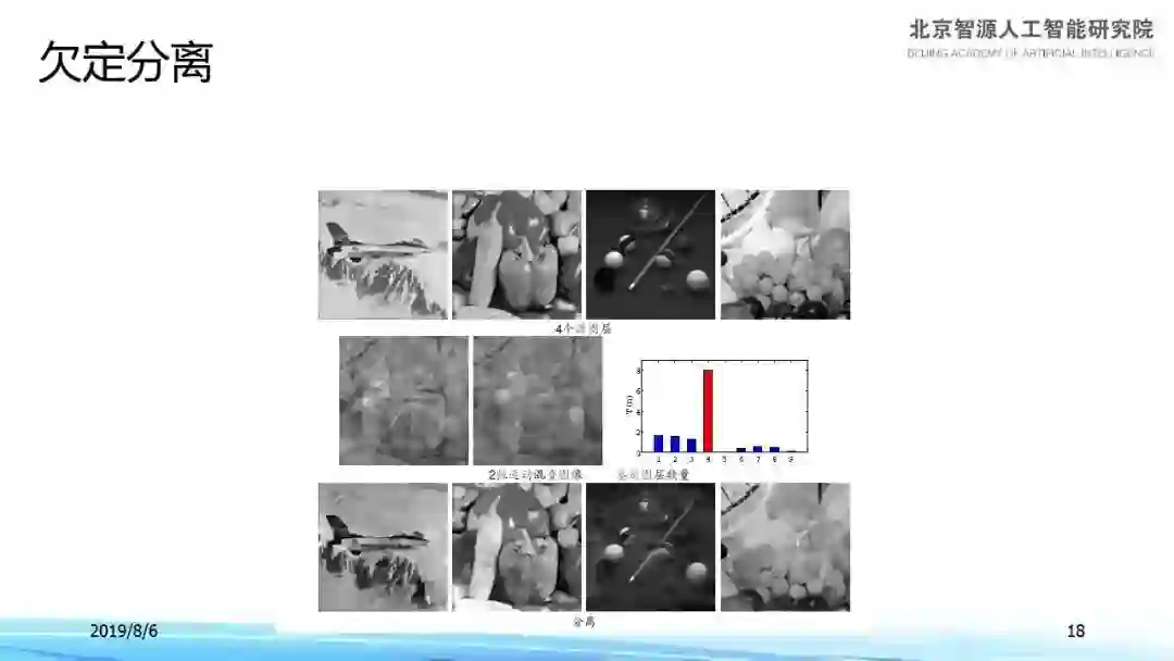 当初我们的设想是希望在只有中间这一列图像的情况下,能够得到左边这一列图像。这个问题在图像里难度非常高,人类能隐隐约约能感觉到一点不同图像的信息,却解决不了分离任务,于是我们就用到了稀疏性——考虑一个物体虽然在整个图像上到处都是,但是其边缘是很稀疏的,这是非常重要的信息,我们通过边缘的稀疏性去计算物体之间的关系,最后右边一列是我们反解出来的图像,和左边一列达成了非常好的对应。当然,混叠图像分离通常无法保证图像质量,但正确分离后能看出图像的大概即可。