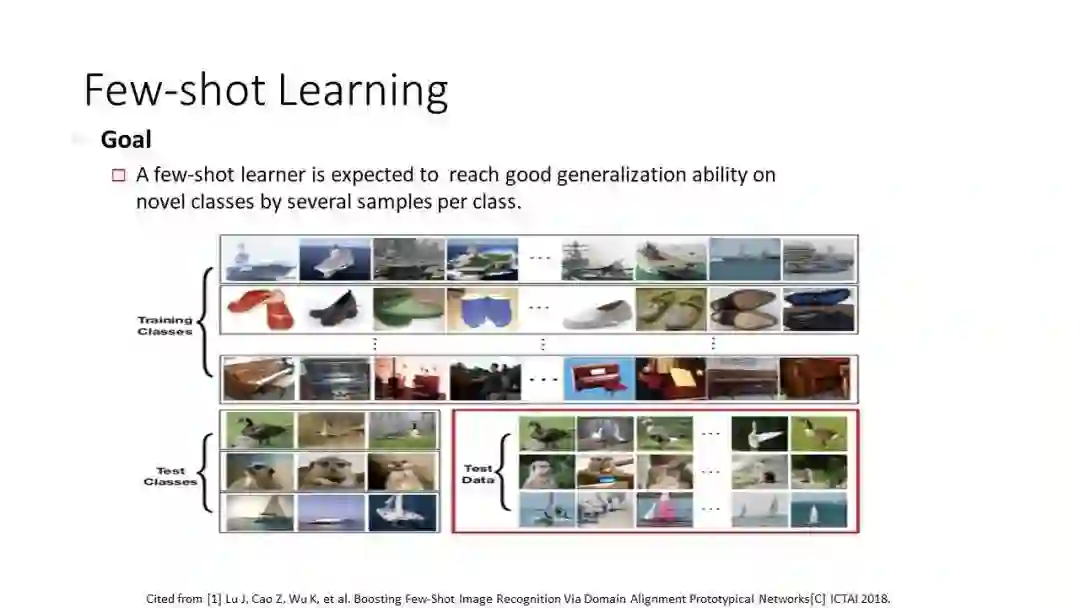 针对这一问题,近几年有一些典型的工作:第一类是通过样本的生成完成工作,其做法是一些图像经过卷积神经网络后,到了特征空间,同时在特征空间做一些扰动,加一些噪声,生成各种各样的图像,使它的泛化性能更好;另外一类工作是当只有左下角那几张图像时,给每一张图像算一个圆心,即做一个平均,算完圆心以后如果新来一个样本 X,可以计算 X 领域内这三个圆形样本之间的距离,它与谁的距离近就分成哪一类,通过求解对新的 query 进行分类。该方法的好处在于适用于只有一个样本的场景,即所谓的 One-shot Learning。但是其效果也比较受限,因为它利用的信息太少,所以效果没那么好;还有一类方法叫“元学习”,其思路是将每一个分类项目当成不同的任务,同时研究这些分类任务之间的共同点,并希望通过这些学到的共同点在以后遇见新问题时,能够根据少量的样本做调整,从而实现对新的类别进行分类的目的——这便是眼下主流的三类思路,以下为详解: