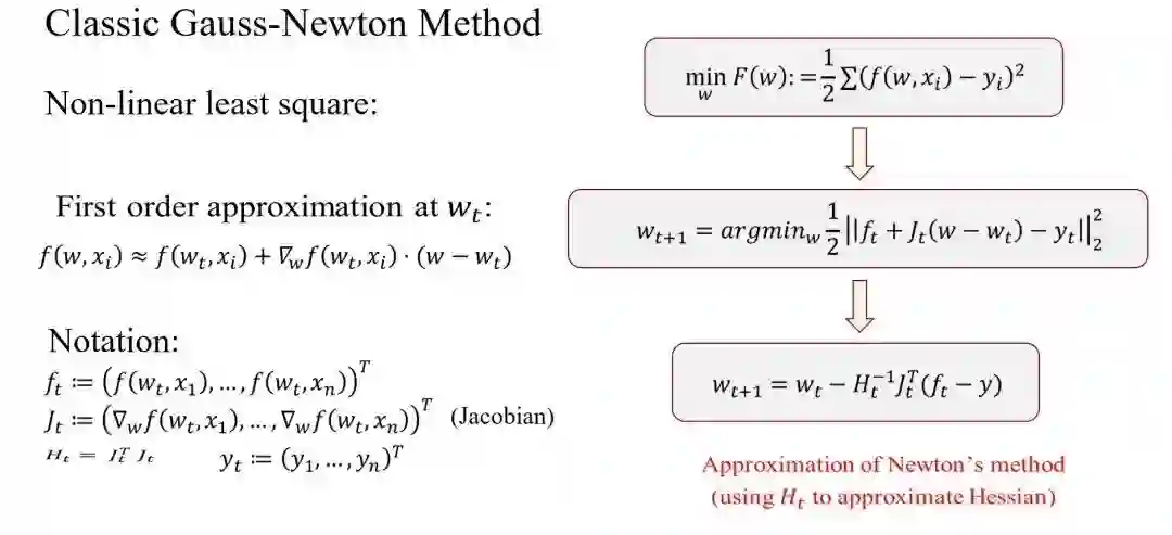 今天大家常用的算法是Stochastic Gradient Descent(SGD),其已然是今天深度学习的标准算法。我们用任何一个今天开源的代码或者从库里调用,配备的都会是一阶优化方法。但根据上面的结论,我们不难发现,更好的方法是二阶优化方法。一阶优化方法只利用了函数的一阶导数信息,而二阶优化方法则在一阶导数外,还用到了一些二阶导数信息。以高斯牛顿法这一二阶方法为例,其特点在于,特别适用于函数特别接近于线性的情况,这种情况下它的收敛速度,也就是迭代的轮数会非常少。