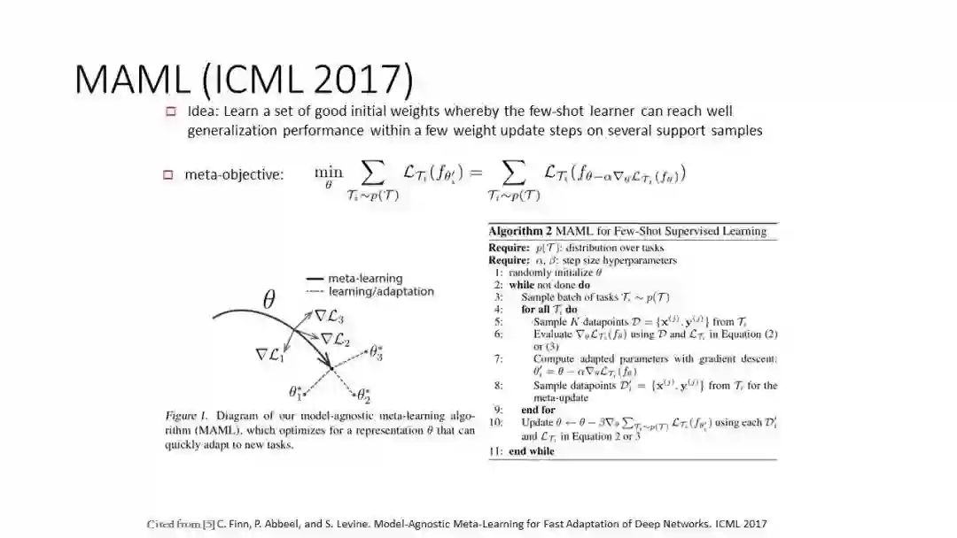 MAML 算法是一种经典的基于元学习思路去解决 few-shotlearning 任务的算法。将每个 few-shotlearning 任务视为一个 task,那么 MAML 的思路是学一个兼顾众多独立 task 的模型参数初始值,以期能在新的 task 的几个样本上只需经过数步的 fine-tune 操作就能使模型在该任务上达到较好的泛化性能(如左上图,三个方向代表三个不同的 few-shotlearningtasks)。