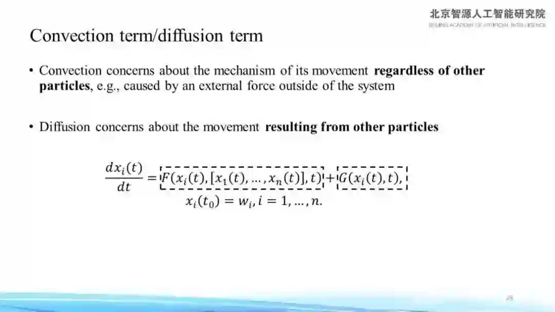 既然要从解常微分方程的角度来看 Transformer,首先要考虑多粒子的动态系统(Multi-particle Dynamic System),这是在物理中非常常见的一种动态系统。这种动态系统的常微分方程,叫做对流扩散方程(Convection-diffusion Equation),对流扩散方程是微分方程中最最常见的一类方程。多粒子动态系统中的对流方程如图所示,比如粒子的位置对时间的导数是两个函数的和,第一个函数是 F,第二个函数是 G, F 函数是 N 个粒子共同作用的一个函数,是 N 元函数,而后面的 G 是对每个粒子的单独作用。这与 Transformer 结构中的 Multi-Head Self Attention 与 FFN 形成了一种很自然的契合,因此我们可以用这种多粒子的对流扩散方程来解释 Transformer结构的含义。