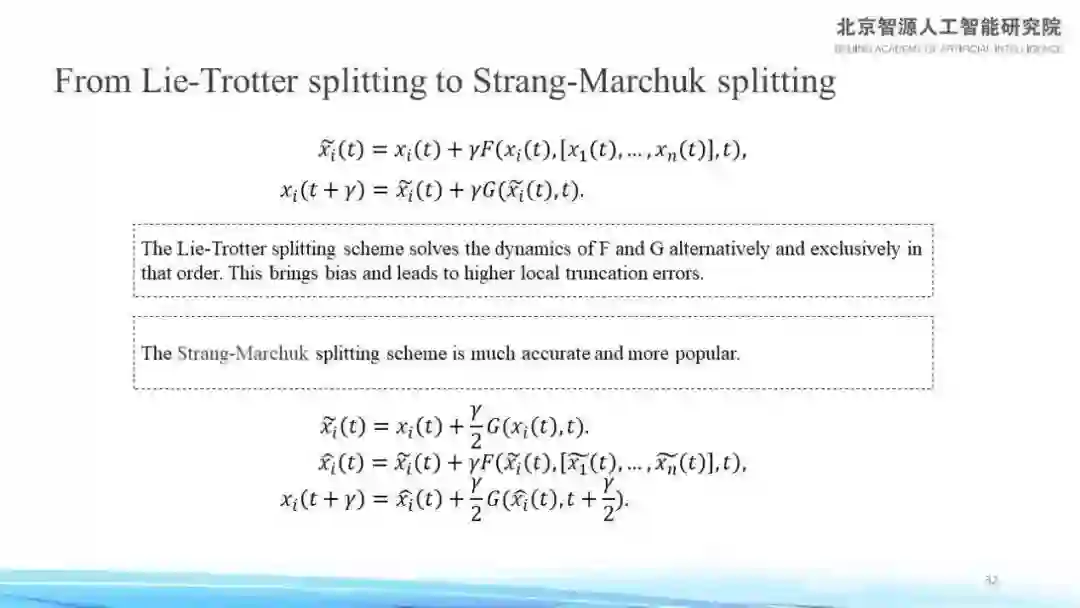 但在常微分方程数值解领域里,对此早已有非常深入的研究,且相关研究早已有上百年的历史,而 Lie-Trotter splitting scheme 事实上是一种早已被淘汰掉的数值解法。相较而言,Strang splitting 是一种比较好的数值解。Lie splitting 是一阶的近似方法,而 Strang splitting 是一种二阶的近似方法。在实际中去解常微分方程的时候, 比起无人问津的 Lie splitting,用到的都是 Strang splitting。