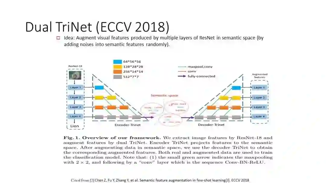 DualTriNet 实际上是对数据很少的类别做 feature-levelaugmentation,它由 EncoderTriNet 和 DecoderTriNet 组成,如上图所示。Encoder 的输入为 ResNet 关于一张输入图像的各层特征图,输出为该图像对应的语义向量,通过对该语义向量进行增广之后(增广的手段包括对语义向量加随机高斯噪声等),便形成了新的语义向量,该语义向量被认为是属于同类的其他图像的语义向量。通过 Decoder 网络对增广的语义向量进行反解码,形成各层的特征图,最后用原特征图和增广得到的特征图对 ResNet 进行充分训练。由于可以无限增广,所以可以达到增加训练数据量的效果。