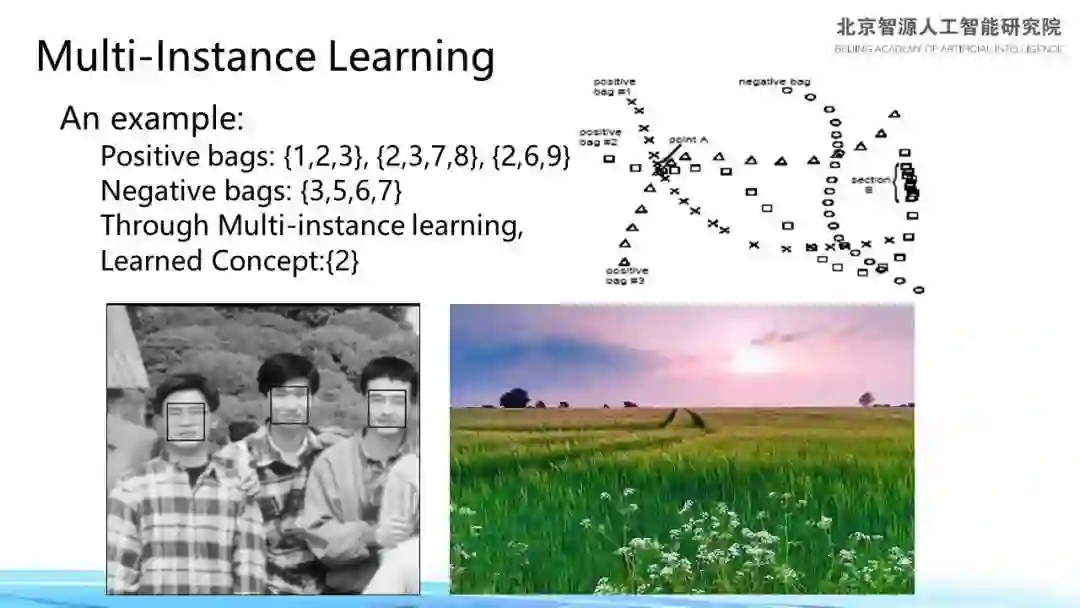 对此我们有一个思路,就是给机器一个很弱的标签,即整张图像有人脸,但不告知具体位置,同时告知右边图像没有人脸。在这种情况下能不能做机器学习,这是我们关心的问题。人们称之为“多示例学习”,其含义是其中有很多例子,已知有的是人脸,有的不是,同时还有很多图像中一个人脸都没有,能否在这样的条件下做学习?
