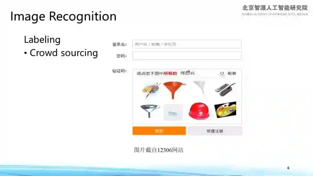 近年来,机器学习领域一直不乏数据标注方面的研究,下图是在 12306 网站购买火车票的体验,其进入页面后用户验证的过程就是在做图像标注,这个方法叫 Crowdsourcing(众包)。而机器学习领域大约在九、十年就有类似的研究,即在众包的形式下如何做机器学习。