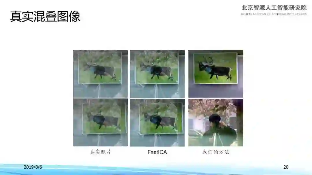 早前所有人做这个工作都是在合成问题上展开,也就是指给定上面两张清晰的图像,进行人为的混合,混合以后再把它分离出来。其原因有二,一是我们知道标准答案,清楚两张原始图像是什么样的;二是我们在混合时严格按照模型操作,比如线性叠加,而且难度已经足够了,所以没有人做真实图像测试。