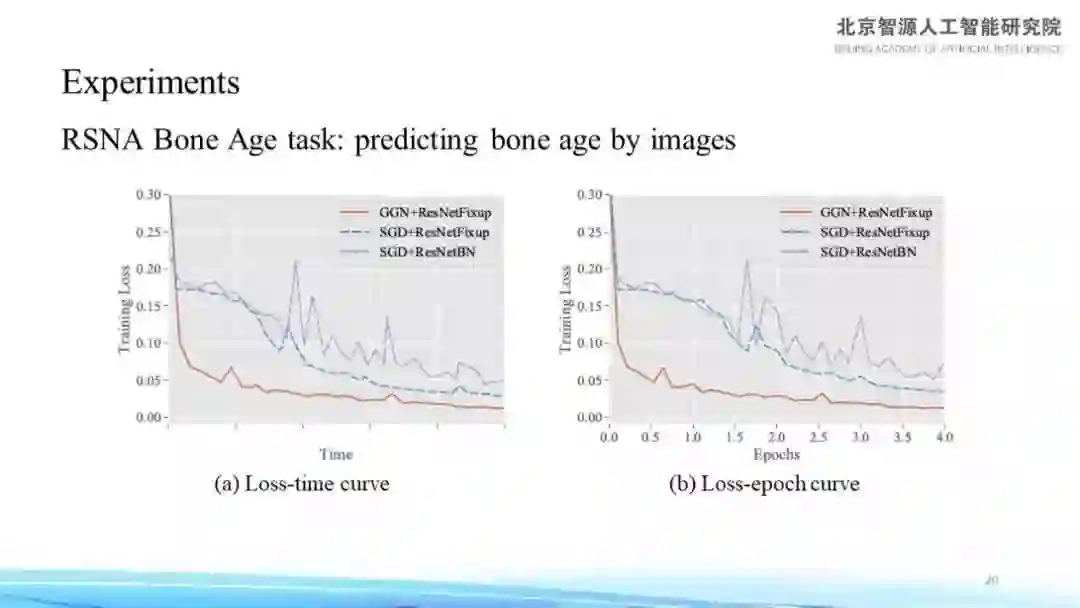 下图所呈现的为部分实验效果,图中红线是新方法的收敛速度,左图横轴代表时间,右图横轴是 Epoch,另外两条线都是 SGD 加相应的一些其他技术,所以可以看到该方法在收敛速度方面占据了很大的优势。