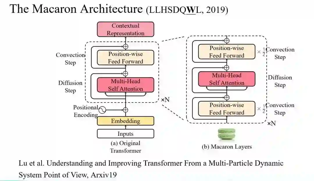 这相当于从理论上启发我们设计新的结构,而这种新的 Transformer 结构叫马卡龙,它的效果比过去传统的两层 Transformer 能提高约 1 个百分点。而 Google 最近提出的新结构 BERT 则消耗了海量的数据、非常多的 GPU 以及训练时间才使原本的 Transformer 性能有所提高。如果在训练数据相同的情况下,二者的性能更是基本相同,但是 Google 的工作训练实验一次需要花费电费 25 万美元。而马卡龙则在“人力”思考的基础上,用数学的方法设计出了一个更好的网络。