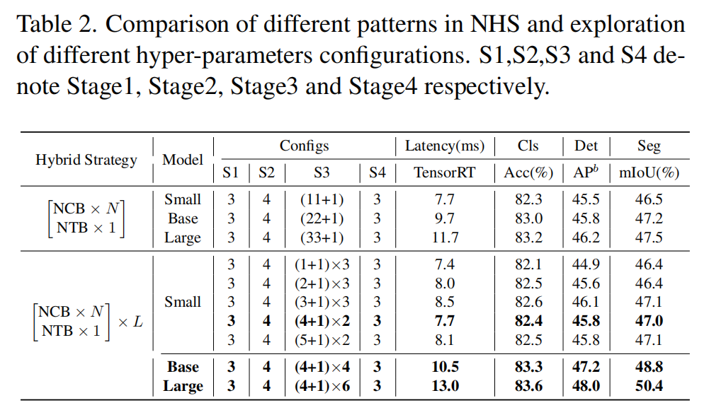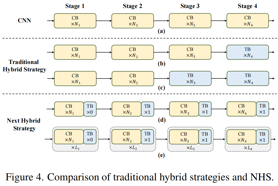 为了克服现有混合策略的失败,作者提出了一种新的混合策略 (NHS),它创造性地将卷积块 (NCB) 和Transformer Block (NTB) 与 (N+1)* L 混合范式堆叠在一起。NHS在控制 Transformer Block的比例的情况下,显著提升下游任务中的模型性能,以实现高效部署。