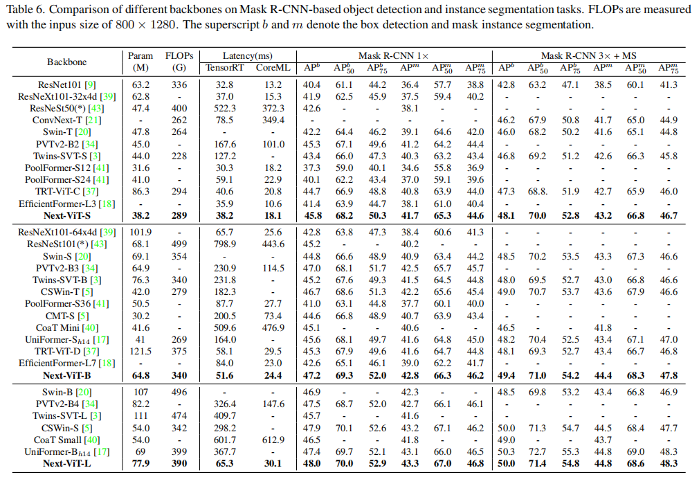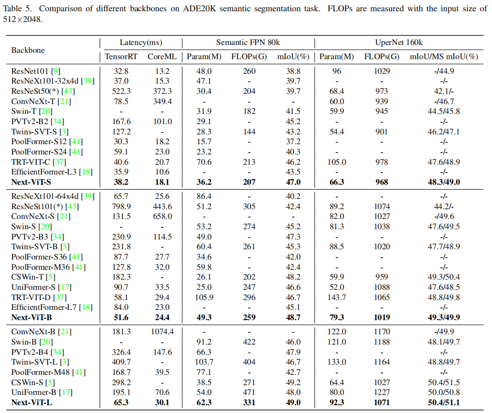 如图1(e)(f)所示,在CoreML上与EfficientFormer相比,Next-ViT超过了4.6mAP(从42.6到47.2),在ADE20K分割上超过3.6%mIoU(从45.2%到48.7%)。