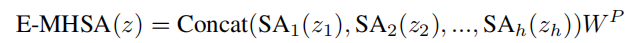 基于这些观察结果,作者开发了Next Transformer Block(NTB)来捕获轻量级机制中的多频信号。此外,NTB 作为一种有效的多频信号混频器,进一步提高了整体建模能力。如图2所示,NTB首先采用高效的多头自注意力(E-MHSA)捕获低频信号,可以描述为: