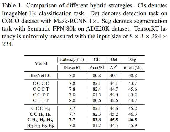 表示在相应阶段以 (NCB×N+NTB×1) 模式堆叠 NCB 和 NTB。表 1 中的所有型号都配备了4个阶段。例如,CCCC 表示在所有4个阶段中始终使用卷积块。为了公平比较,在相似的 TensorRT 延迟下构建所有模型。第 4 节介绍了更多实现细节。如表 1 所示,与下游任务中的现有方法相比,所提出的混合策略显着提高了模型性能。
