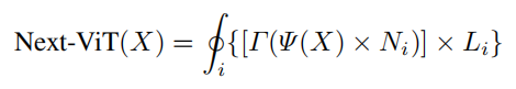 将 NCB 和 NTB 与上面的 Next Hybrid Strategy 进行叠加来构建 Next-ViT,可以正式定义为: