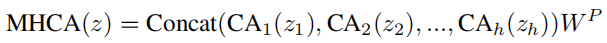 在这里,MHCA从h个并行表示子空间中捕获信息。为了促进多个头部之间的信息交互,还为MHCA配备了一个投影层(WP)。
