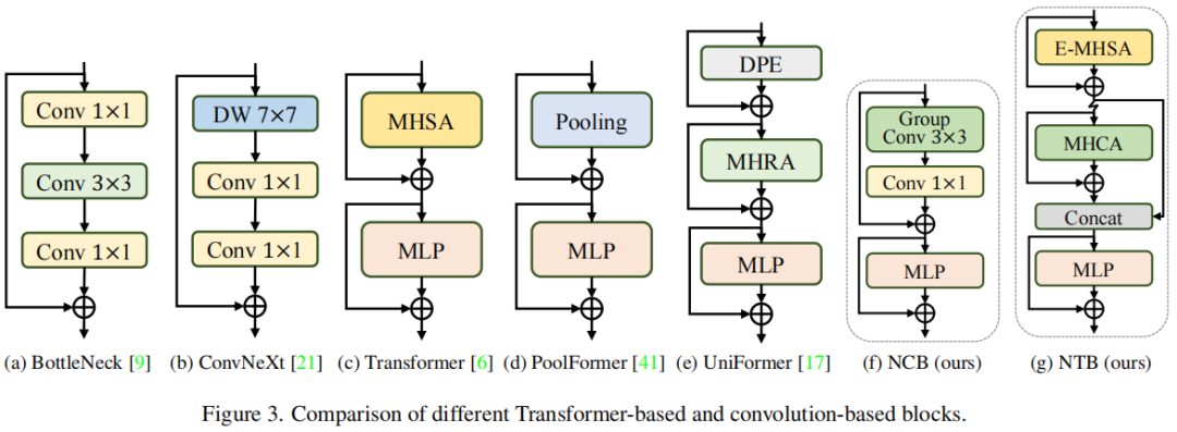为了展示所提出的 NCB 的优越性,首先重新审视卷积和 Transformer blocks 的一些经典结构设计,如图 3 所示。ResNet 提出的 BottleNeck 块因其固有的归纳偏差和部署而在视觉神经网络中长期占据主导地位。大多数硬件平台的友好特性。