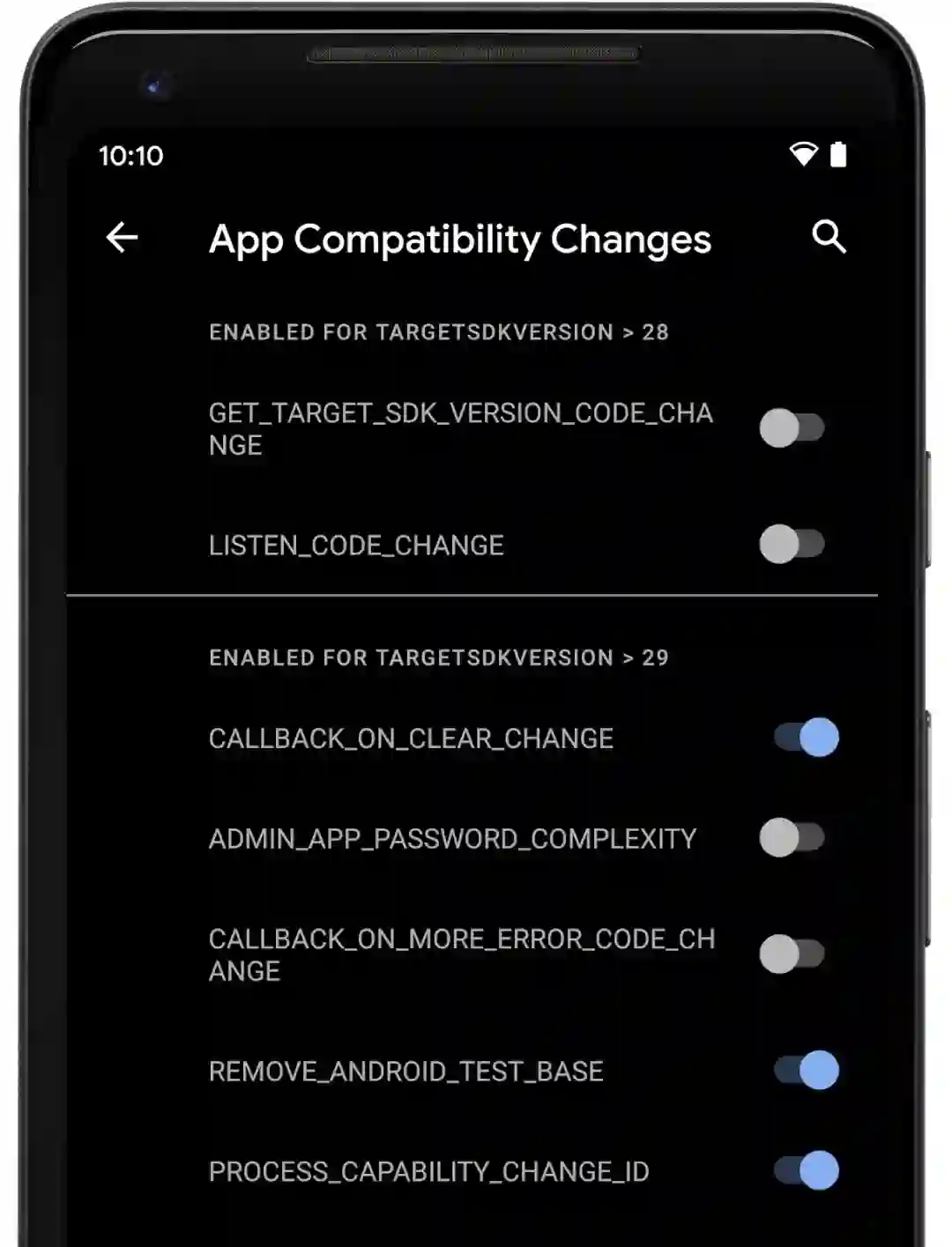 为帮助大家轻松测试应用兼容性,我们为多项重大变更提供可切换选项,因此大家能通过开发者选项或者 adb 强制启用 / 禁用这些变更。