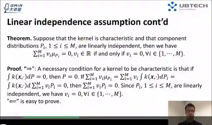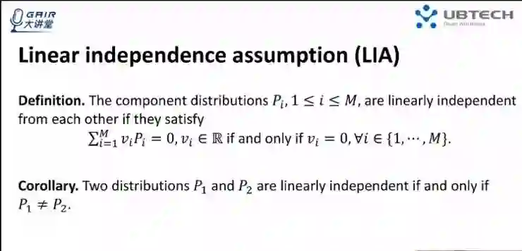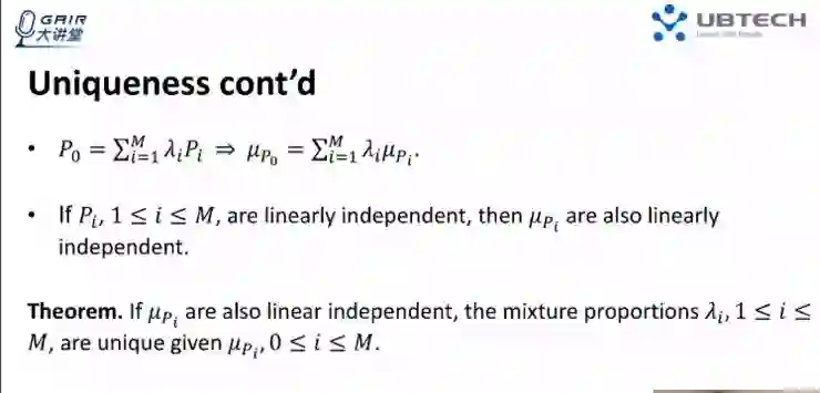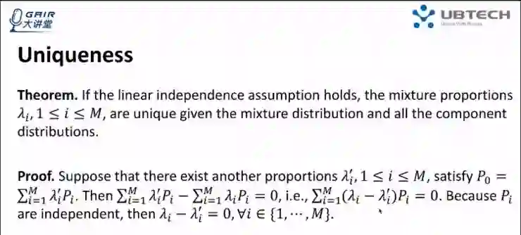 在线性独立的假设条件下,能够证明出这个混合比例的唯一性,假设 P0 是由 P1 到 PM 的线性组合而成,而且组成分布满足线性独立假设。如果给定这个 P0 和所有组合分布的情况下,该比例是唯一的。证明非常简单:利用反证法(和线性代数里面证明的方法一致)证明。假设存在另外一组系数使得这个混合同样成立,通过两个不同组合的系数相减等于 0,借此可以进行推导。具体推导讲解,大家可以回放视频至第 19 分钟查看。
