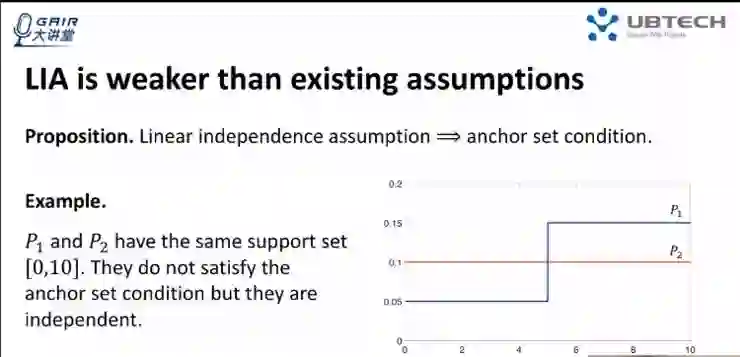 同时也可以证明线性独立假设弱于 anchor set condition 假设。同样给一个例子来简单说明,比如说右图这两个分布,我们可以看出这两个分布的 suppose set 都是 0 到 10,但是这两个分布显然是不一样的,所以它们俩不符合 anchor set 的假设,但它们俩线性独立。