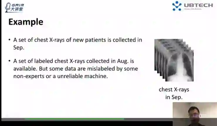 我们同样来这个例子,假设 8 月份的数据(已经标记好),由于某些原因标记出现了错误,而在 9 月份,得到了一些核磁共振图像,我们能不能在 8 月份的 X 光片成像中提取一些有用的信息来辅助核磁共振成像的最后分类?这个问题比较有意义,因为在现实医学生活中我们往往有很多可以辅助你的医学数据,这些数据往往很难标记,很多数据可能标记错误,我们希望用这些辅助数据来学习到一个新的病例中,帮助一个新的病例来提取一些不便的信息,帮助它们的学习,这个问题我们该如何来解决?