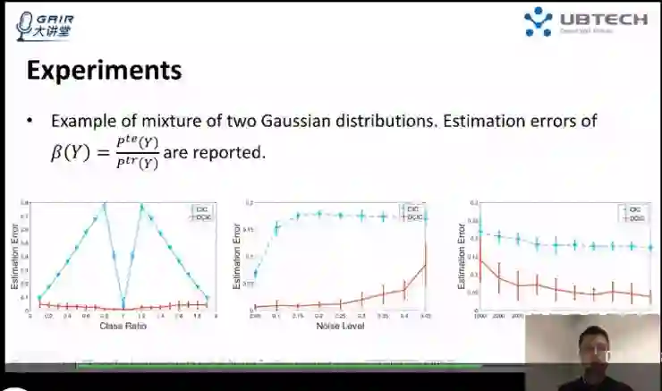最后,我们通过一个实验来验证。训练数据和测试数据的分布均由两个高斯分布混合而成,但比例不一样。这里 beta 是测试数据 P^te(Y) 比上训练数据 P^tr(Y) 的比例,可以看出在不同的 beta 时(图中最左),我们的方法能够得到比较一致的结果。在训练数据中有不同的噪声大小的时候,我们的方法表现也是比较一致的(图中)。可以看出当训练样本逐渐增大,我们的算法也逐渐收敛到最优的解。而对比的方法都出现了比较大的误差,甚至有时候是错误的(图中最左)。通过这个实验可以验证出在该问题中我们的方法的有效性,也可以看出 MPE 在这个问题中的延伸应用。