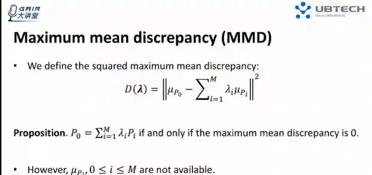 我们可以利用最大平均差异的方法来求出λi 的解,利用的定理为:如果两个分布它的最大平均差异是 0 的话,当且仅当这两个分布是同一个分布。所以最小化平方后的最大平均差异的值,就可以求出λi。但问题是我们没有 Pi 的表达式,不知道核均值嵌入到底是多少。