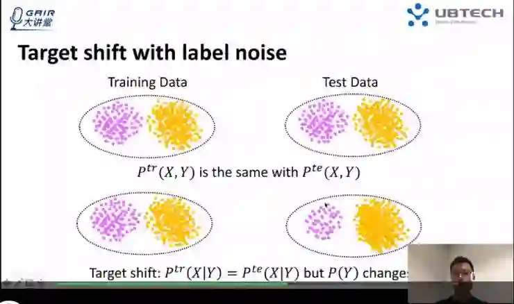 在传统的数据训练中,我们假设训练数据和测试数据都采自同样的分布,而在 Target Shift 这个问题中,我们假设各个类别的分布都一样(如图中圈内的紫色和黄色分布),但是每个类的比例发生了变化。Target Shift 就是来检测 P(Y) 的变化。有一个更大的挑战:我们研究在训练数据中有一部分数据标记错了,把第一类标记进了第二类,第二类标记进了第一类,在这种情况下,我们是否还能够检测出 P(Y) 的变化呢?