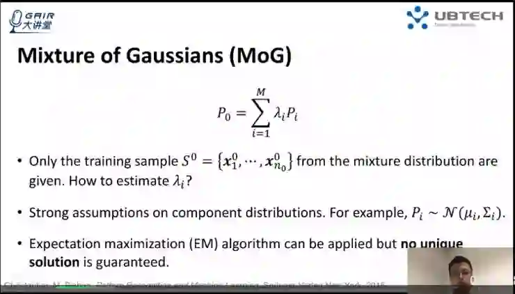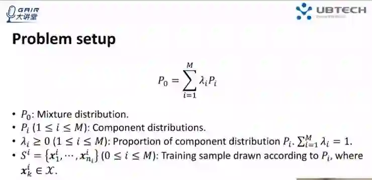 第一个 setting,是指假设只从混合分布 P0 中采样了一部分数据 S0 时,如何估计λi。其实没有任何组成分布的信息是无法完成这项工作的,所以往往要对这些分布加非常强的假设。在这种情况下,我们一般假设组成分布满足高斯分布的假设(当然也可以是其他分布假设),这就得到了我们通常所说的混合高斯模型。高斯模型可以通过 EM 算法来求解各个组成分布的均值和方差矩阵,同时也能求出λi。该模型的问题在于:利用 EM 求解混合高斯模型时,不能保证得到唯一解。
