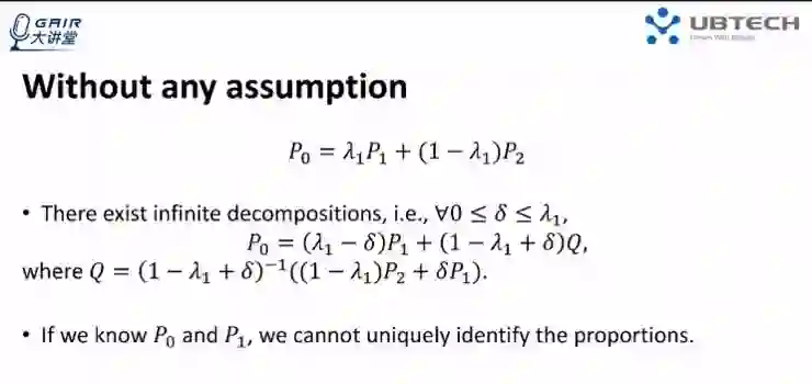 首先假设对这些分布没有任何假设的情况下,其实可以看出这个分布 P0,可以存在任意多的分解,比如把 P1 的一部分组合到 P2 之中,就可以得到一个新的分解。这样,如果只知道 P0 和 P1 的信息,我们是无法求得 P1 和 P2 的比例,因为这个比例可以是任意多的。
