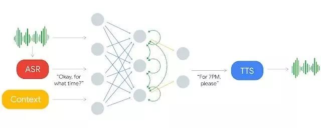 输入语音先经过自动语音识别系统(ASR)处理,生成的文本会与上下文数据以及其它输入一起输入 RNN 网络,生成的应答文本再通过文本转语音(TTS)系统读出来。