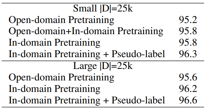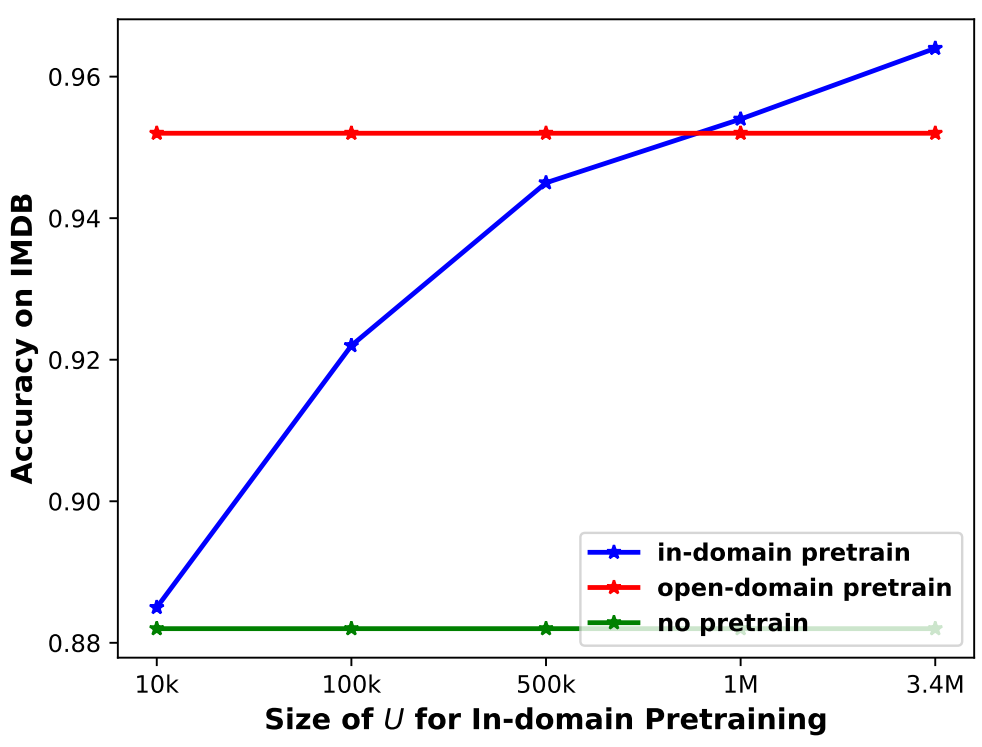 很小的时候,效果差于开放领域预训练,当 足够大的时候,领域内预训练就超过了开放领域预训练。这说明:领域内未标注数据的大小对最终结果影响极大,总的趋势是越多越好。