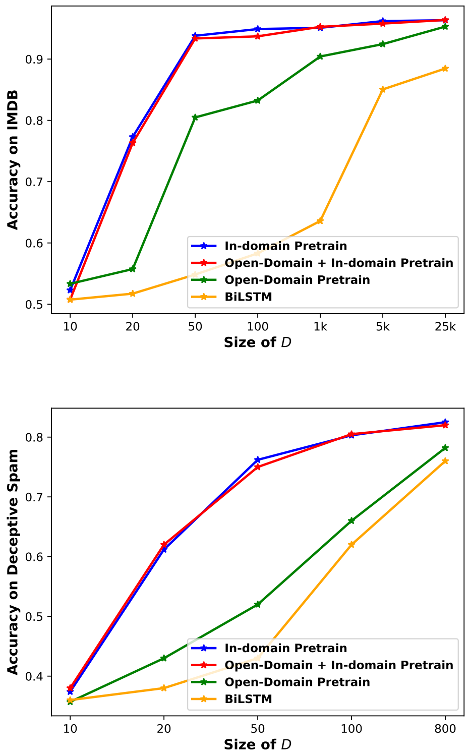 下图是不同的Teacher训练方法在IMDB和Spam上的结果。Open-domain是在大规模通用语料上预训练(也就是已经预训练好的RoBERTa),In-domain是在 上预训练,所有的模型最后都要在 上微调。