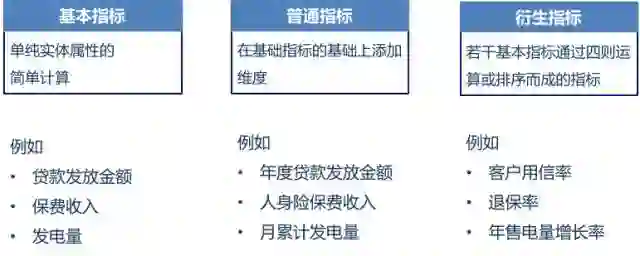 先对指标下个简单定义:指标是一种衡量业务目标的方法,是企业用来描述现有业务或预测未来业务的工具。比如银行业的贷款发放金额,保险行业的保费收入,电力行业的发电量等。企业指标几乎涵盖了企业全部的业务范围,即使按照最粗的维度来划分也可分为基本指标、普通指标、衍生指标三类: