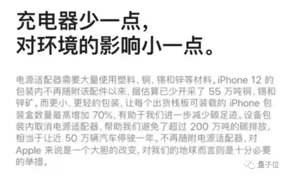 苹果公司最近公布了近两年环保成绩单,其中提到iPhone产品已经不再随机配备充电器,这节省了约55万吨的铜、锡和锌矿石。