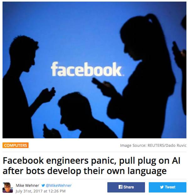 我刚从 CVPR 回来,就发现我的 FB/Twitter 的时间流充满了这些说 Facebook 的研究员开发的 AI 智能体发展出自己的语言,描述各种世界末日景象的文章。