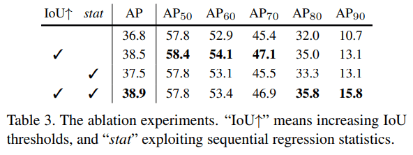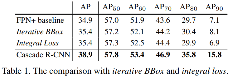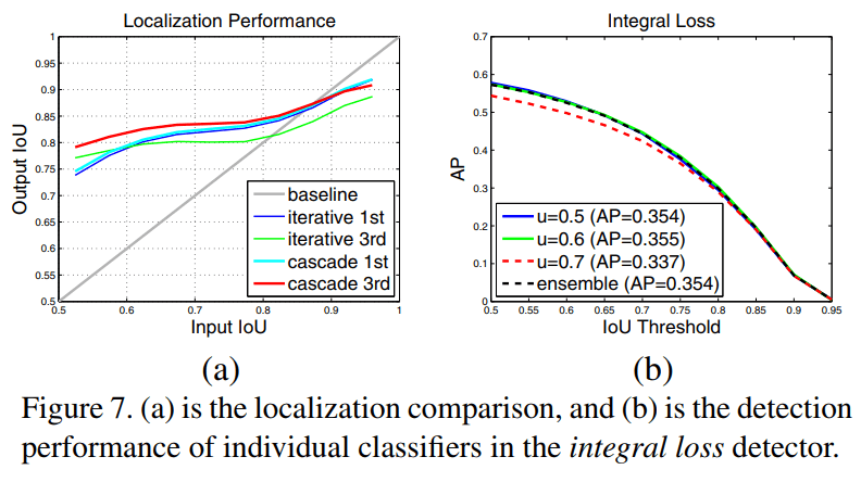 通过下图(a)可以看出,iterative bbox三次迭代后回归质量很差。通过(b)可以看出即使使用集成,integral loss也没有太多精度上的提升。