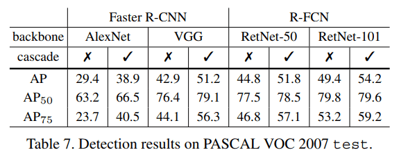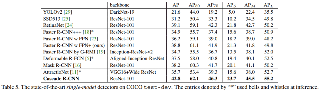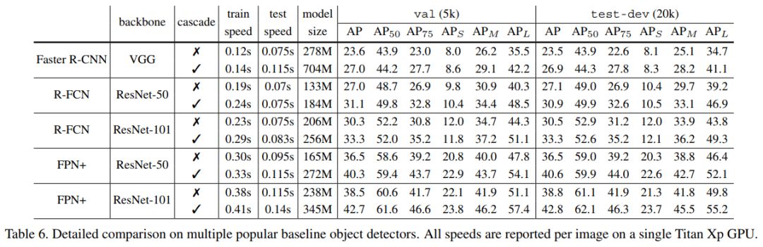 各方法检测精度对比,Cascade R-CNN 在高阈值的评估规则下效果很好。