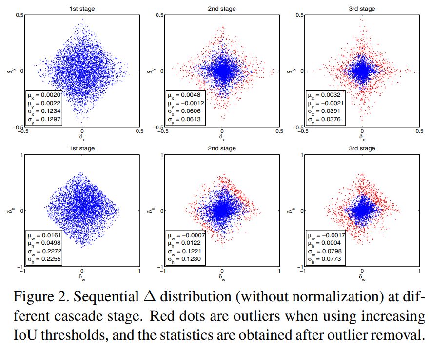 这样做存在两个问题: (1)从Figure 1 (c)中可以看出,使用u=0.5训练的检测器H1,对于下次输入的高质量IoU,再次回归结果通常并不是最优的,当输入的proposals的IoU>0.85时,回归结果反而会下降; (2)作者实验发现,每次迭代后输出的bbox分布都会有很大的变化,如Figure 2所示,检测器对第一阶段后的数据分布预测效果不是最好的。