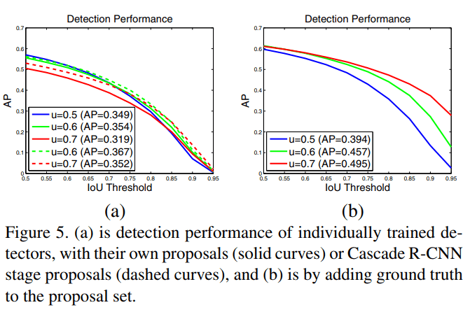 图(a)中实线表示不同阈值的单检测器精度。图(b)为输入proposals中加入真实bbox的结果。图(a)中虚线为分别用二,三阶段级联检测器预测的bbox代替原始的proposals的结果。