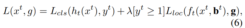 在分类阶段,分类器是关于输入图像区域 x 的函数,记为 h(x);输出是 M+1个类别,0 表示背景,给定义训练数据 (xi,yi),分类的损失函数定义为