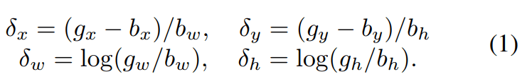 回顾一下bbox回归的过程。边框坐标 b=(bx,by,bw,bh ),表示图像 x 的中心坐标和宽高,另候选区域坐标为 b,真实坐标为 g,那么 bbox 回归可以用公式表示为 gi=f(x,bi),损失函数表示为 Lloc (f(x,bi ),gi)。为了保证回归尺度和位置的不变性,通常对偏移量 Δ=(δx,δy,δw,δh ) 进行回归,具体定义