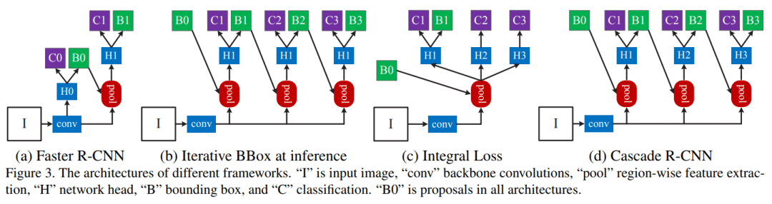 其中H0为检测的第一阶段,图中所有的B0均是第一阶段输出的proposals;H1,H2等为检测器,负责对输入的proposals进行分类和bbox回归。
