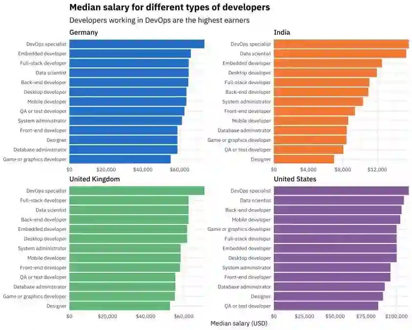 当然,薪酬高低也与所从事的职业有非常大的关系。根据对全球四大 IT 市场的调查,DevOps 专家全部高居榜首,可见市场对这一技术的需求量有多大。除此之外,数据科学家、全栈工程师、嵌入式开发工程师、桌面开发人员的市场受欢迎度均较高。