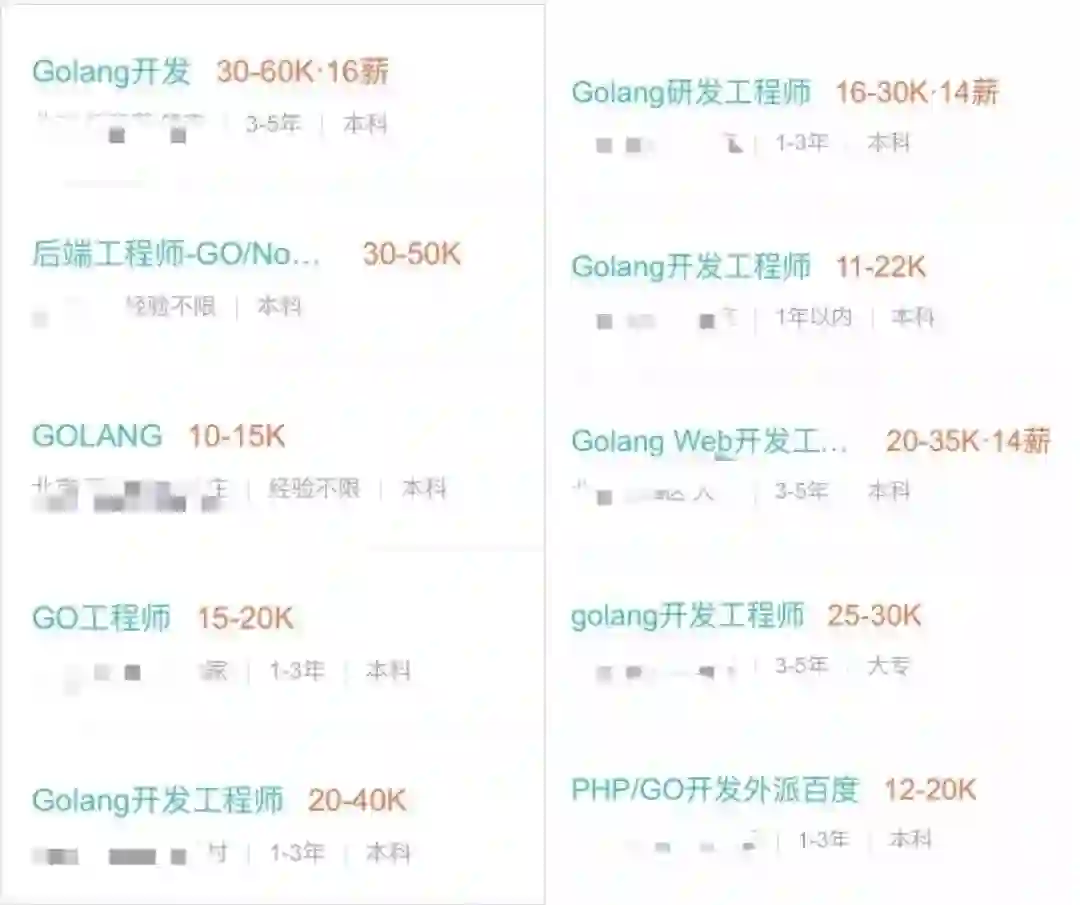 国内整体的薪资水平要略低于全球,需求量较大的依旧是 Java、Python 这类语言。如果与全球薪资较高的编程语言比的话,如果对国内主流招聘网站进行统计,以“Go 语言”为关键字在全国范围搜索,热门地区(北上广深等需求量较大的城市)月薪基本集中在 15-30k 人民币之间,一线互联网大厂的薪酬确实更具竞争力,比如 BAT、高德、奇虎 360、滴滴等,不仅给出的月薪更高(25-60k 之间浮动),不少还明确标出可以给 14 至 16 个月的薪水,而所要求的工作经验基本都在 3 到 5 年。
