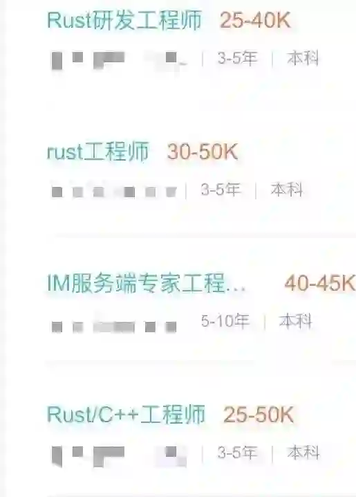 国内对于 Rust 的招聘需求并不旺盛,可搜寻到的岗位不到 Go 语言的十分之一,只比 Clojure 好一些,基本是规模较大的企业对此才有招聘需求,比如今日头条、滴滴等,给出的薪资倒是还算优厚,月薪基本集中在 25k 人民币以上。